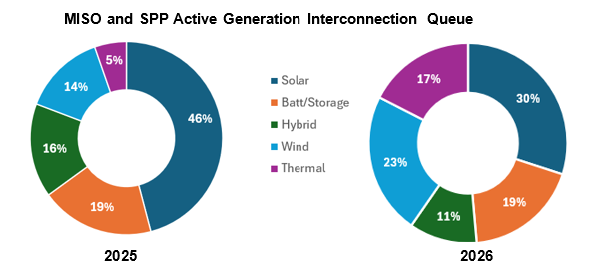 The figure below shows the breakdown of generation types within the MISO and SPP queues between 2025 and 2026. You can see a notable shift toward thermal resources (increasing from 5% to 17%) in 2026, while solar requests dropped significantly (from 46% to 30%) due to the sunsetting of federal tax incentives. Despite the recent rise in thermal generation (primarily natural gas), Inverter-Based Resources (wind, solar, and battery) still dominate 83% of the total queue, cementing their role as the primary future energy source for the region.